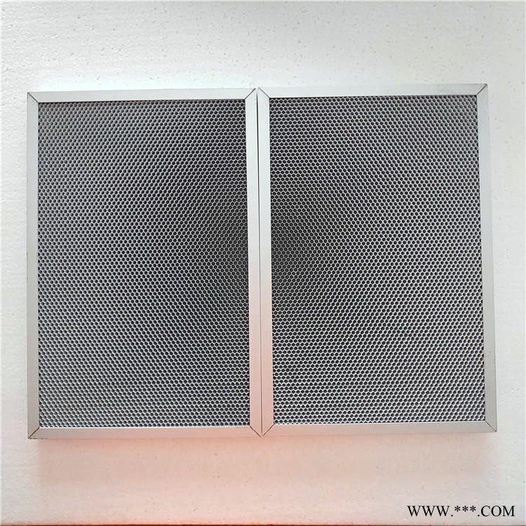 鋁基光觸媒濾網由鋁金屬六方網孔上沉積光催化材料制成,使用壽命長,不易老化。經紫外光照射(理想紫外光波長253nm-365nm左右),氧化分解污染物和異味,氧化能力強,能夠破壞細菌的細胞膜,因而還具有殺菌功能。