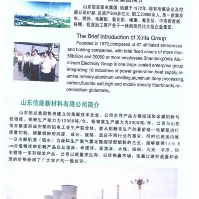 山東信能新材料有限公司是我國**大的鋁電聯合企業信發集團投資建立的高新技術企業,成立于2006年。是全國**一家以鋁電集團為依托的大型鋁粉廠,產品遠銷至歐盟、美國、東亞南亞等地區。公司主導產品是球形金屬鋁粉,年產能15000噸,是我國同類產品產銷能力**大的氮氣霧化法生產鋁粉企業。公司與集團的電解鋁、鋁合金等企業形成聯合體,是國內**的以電解鋁液為原料生產球形金屬鋁粉的企業,產品廣泛應用于太陽能電子漿料、導電漿料**金屬顏料、耐火材料、化工催化劑、農藥、鋁合金粉末、固體**推進劑、及防腐金屬涂料等行業。