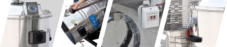 被吸的物質(zhì)收集到一個可拆卸、固定輪子的集塵箱里(80升),可以很方便和安全地處理所收集的物質(zhì)。集塵箱不銹鋼(AISI304)做成,真空吸塵器放置在配有防靜電輪子和接地鏈的堅固鋼鐵底盤上,并靜電接地避免靜電引起火花。