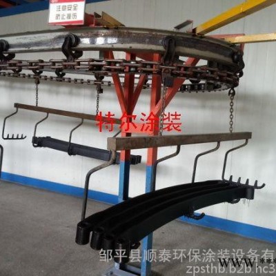 懸掛鏈輸送系統:選用XT-160型封閉懸掛鏈,包括軌道、鏈條、旋轉機構、一次吊具,驅動裝置、張緊裝置、電控系統,為保證整條線運行自如,在噴漆室內及上下工件處設有急停開關便于操作,單點吊掛300Kg,雙點吊重500Kg,180度自動旋轉,從而保證工件在噴漆時每個部位都能噴到。從而滿足生產需要。驅動裝置的牽引力根據全線所掛工件重量計算,設計時根據懸掛輸送機說明書選配不同驅動力的電機便行,張緊裝置同樣根據全線重量確定配重塊的多少。